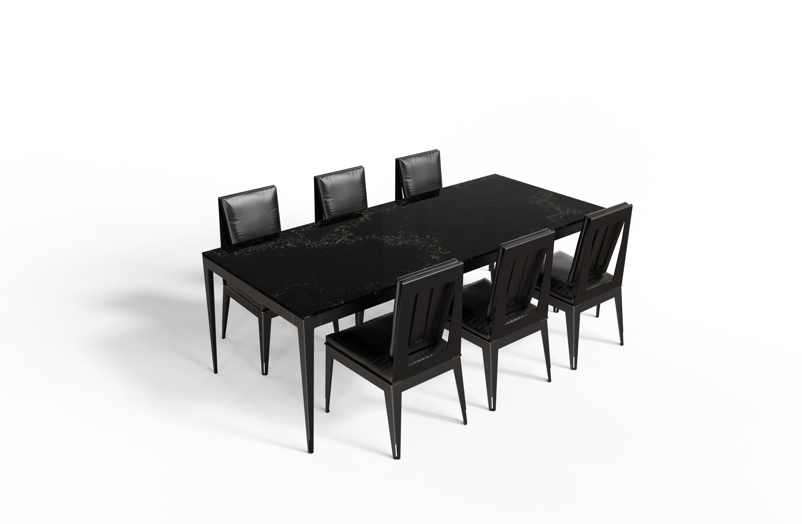 Dining table and (6) dining chairs with satin black metal structures (Aluminum) and Brass inserts. Table top in stone, marble or wood. Chair’s upholstery in black leather filled with natural materials or technical fabrics.