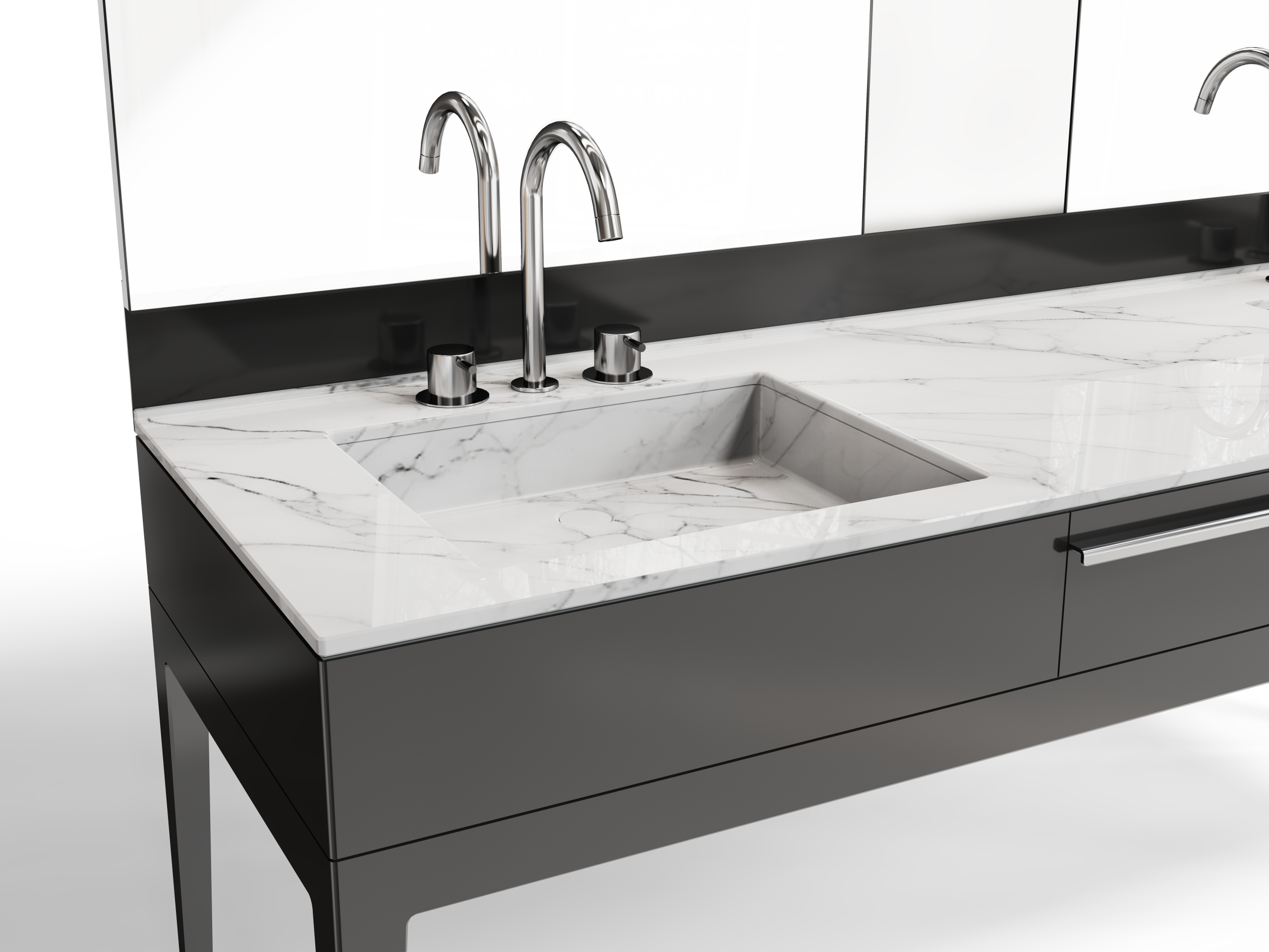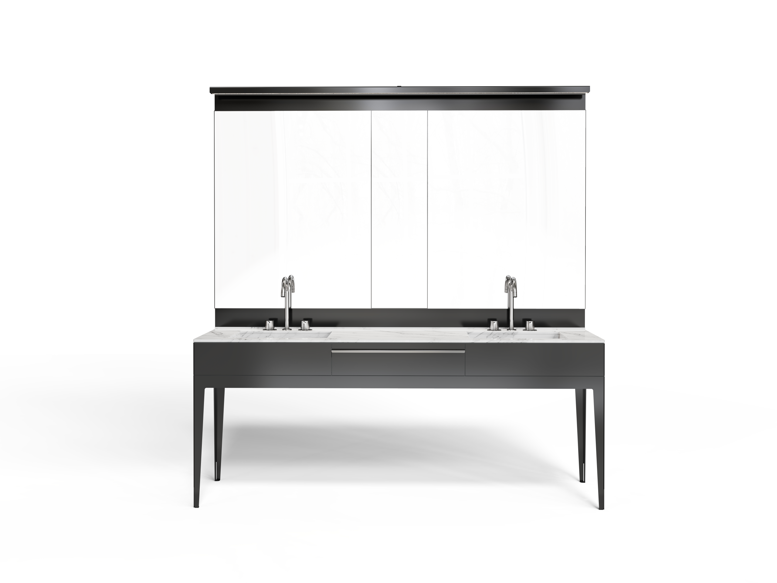 Double Vanity with metal Structure, metal hardware and faucets, double mirror and upper light (LED bar).
