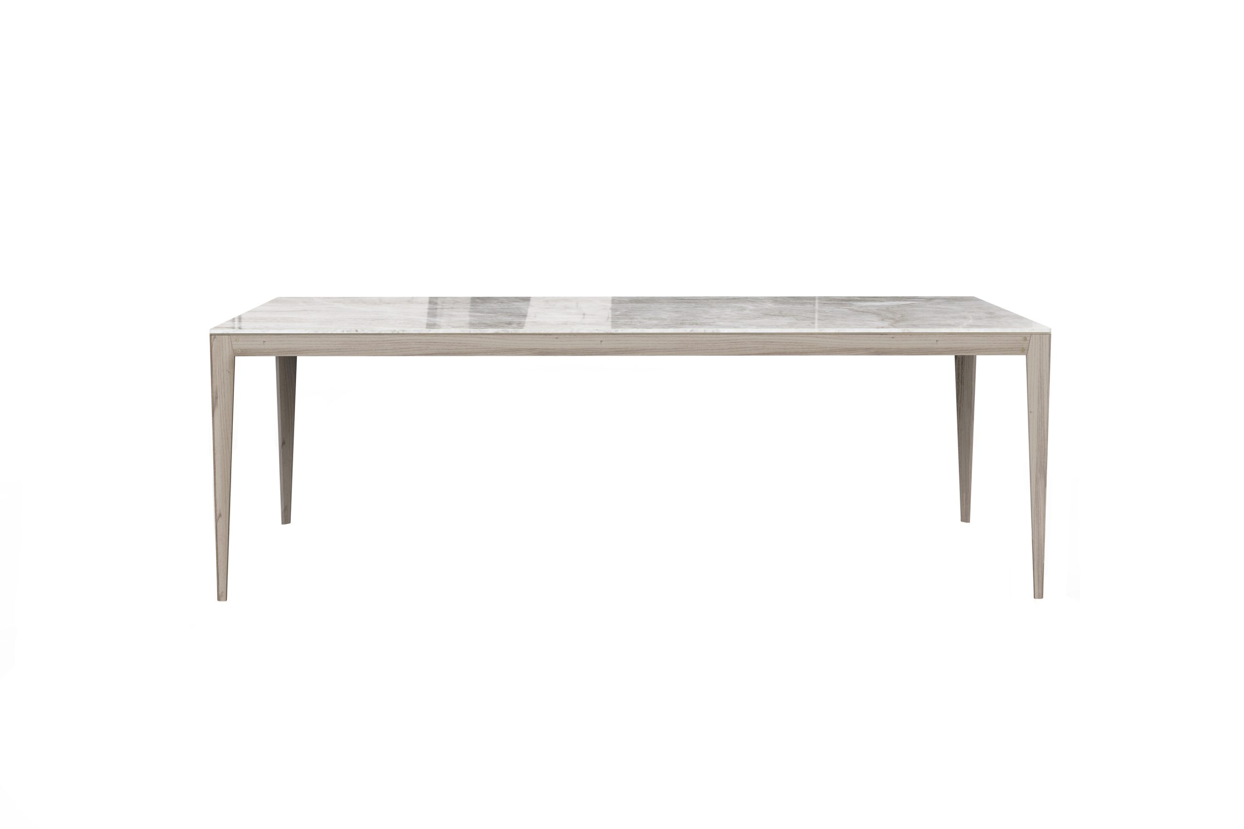 Wood Dining Table with wood base, metal reinforcements, brass inserts and wood or stone top.
